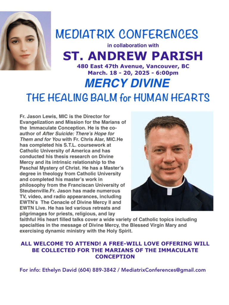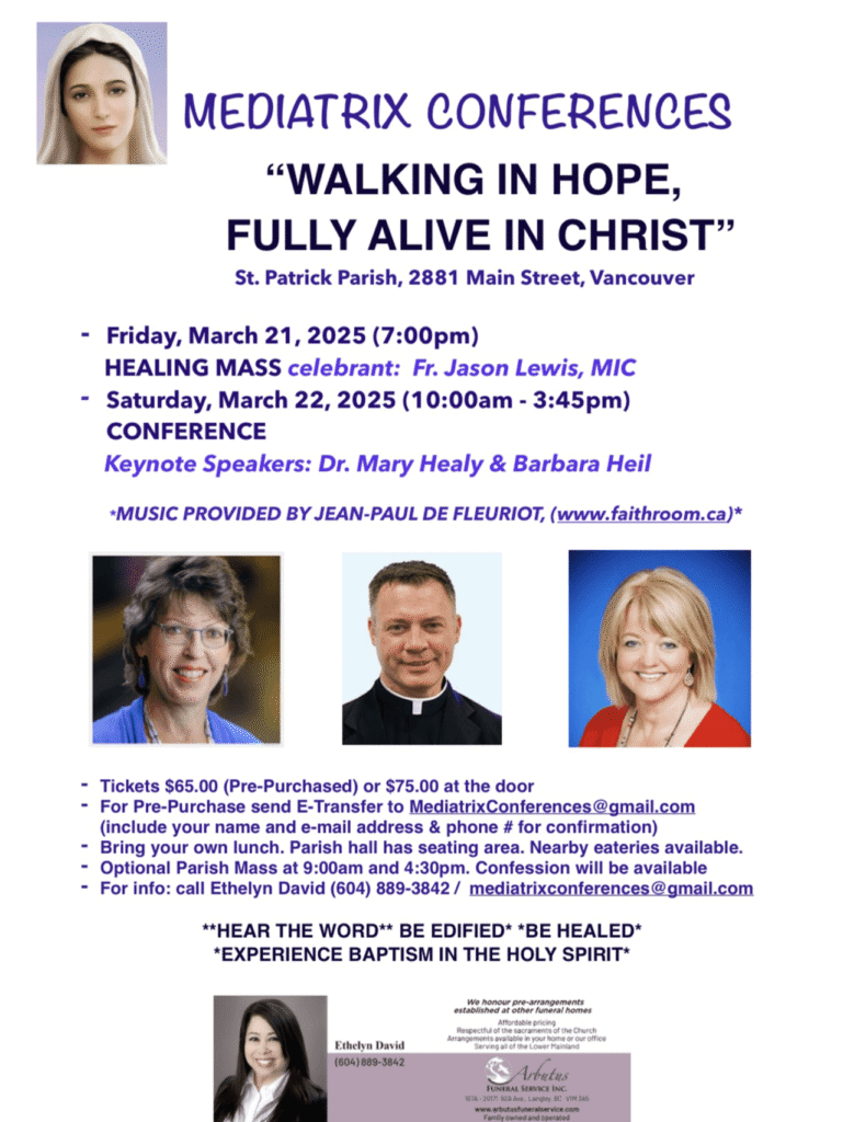 We are always delighted to hear from you and happy to tell you about the work Mediatrix Conferences is doing. Please connect with Ethelyn David via email, phone, or by submitting your message through our contact form. Thank you. Blessings in Christ!